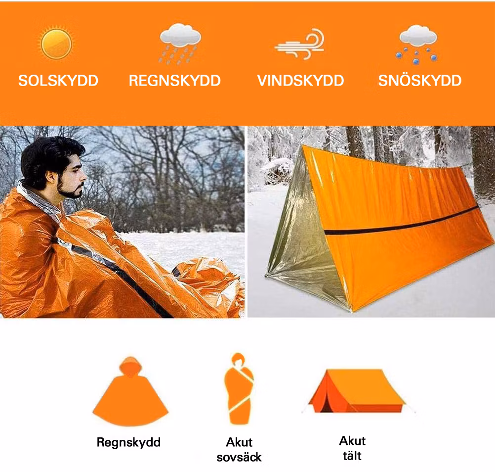 Den vattentäta nödfilten behåller 90 % av kroppsvärmen, minskar kroppsvärmeförlusten, förebygger och bekämpar hypotermi och ger nödskydd under en mängd svåra förhållanden. De är en viktig del av utomhusöverlevnad och gör dina utomhusaktiviteter säkrare.