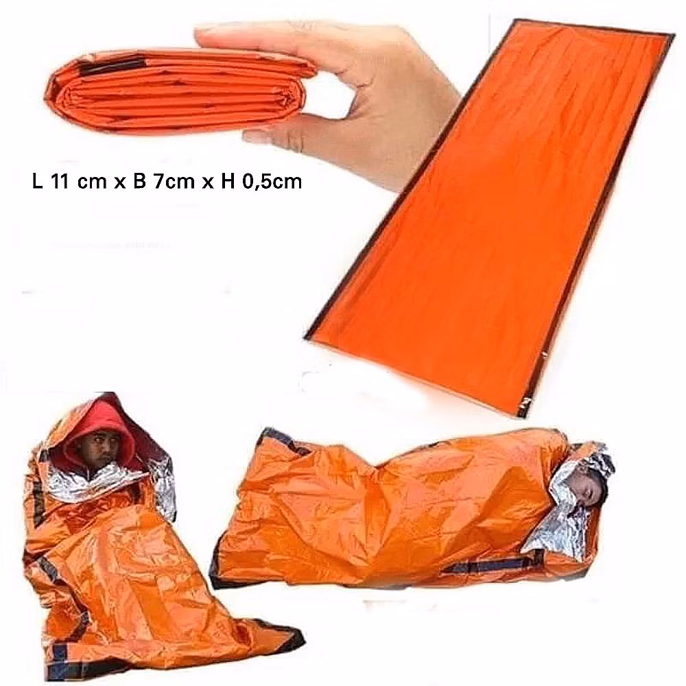 Nödfilten är gjord av aluminium PE-film som är lätt, vattentät och lätt att bära. Nödfilten fälls ihop till en liten filt och kan förvaras nästan var som helst, så du har plats i ryggsäcken för annan utrustning.