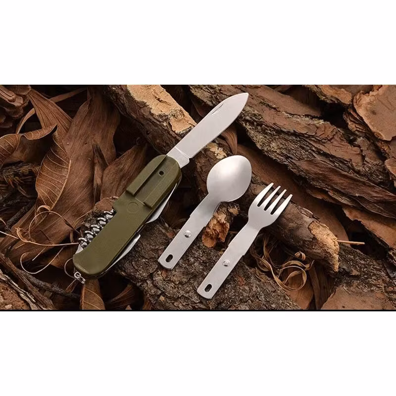 Denna smarta design erbjuder en löstagbar sked och gaffel, en vass fällkniv, en praktisk ölöppnare och en elegant korkskruv - allt samlat i ett lättviktsformat som smidigt glider ner i ryggsäcken. Det är inte bara ett bestickset; det är en överlevnadspartner som inte sviker dig när hungern eller behovet av ett verktyg uppstår.